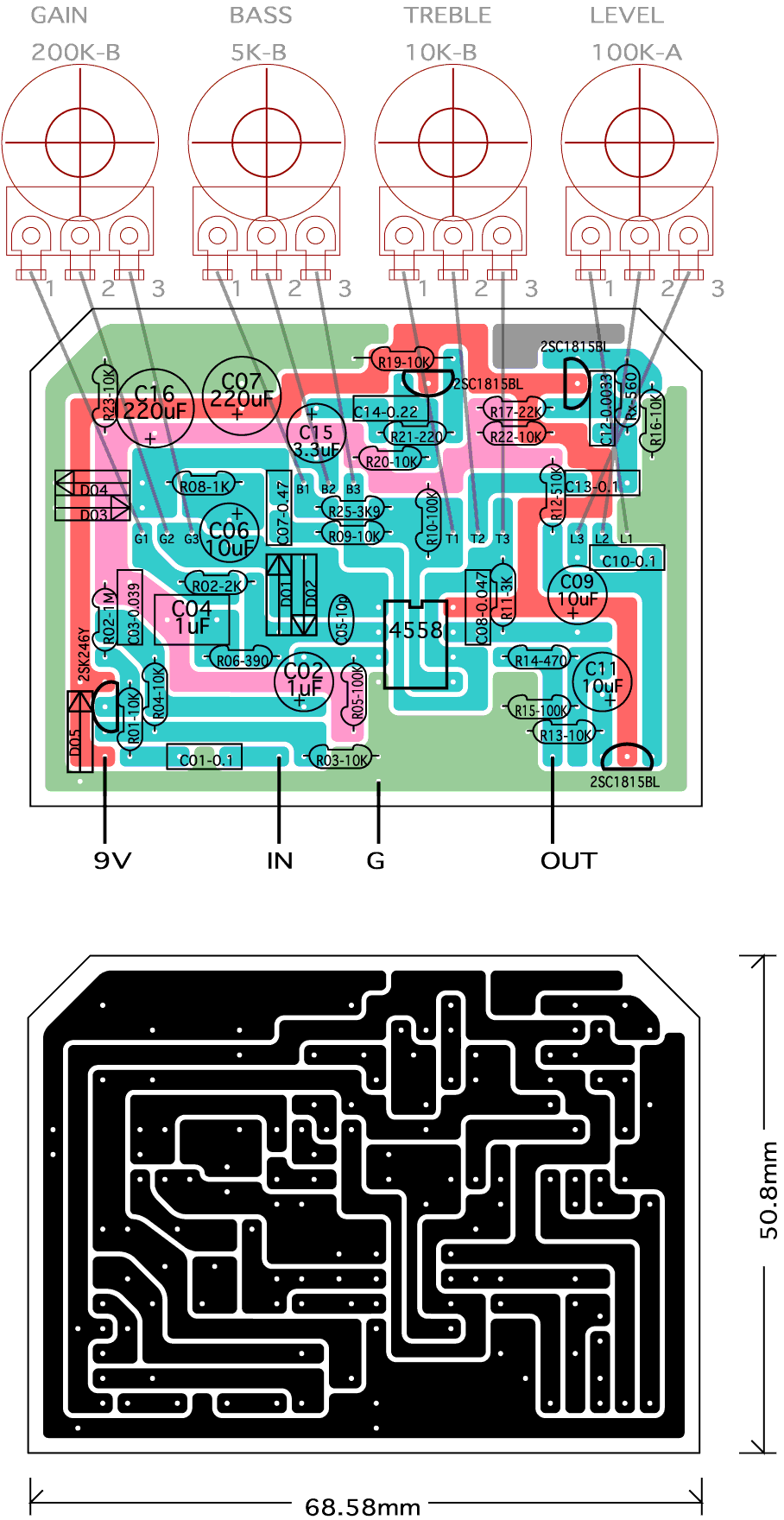 ベースポットをある位置まで絞ると使えない音なので可変の範囲を狭める為R25の3K9を10K入れたのが失敗。