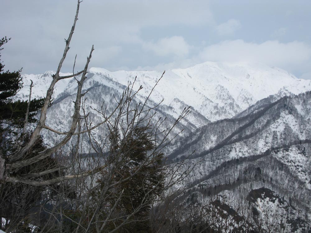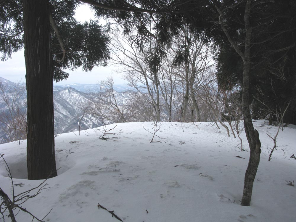 大段山(895m)は飯豊連峰大日岳から烏帽子山と連なる山であり、西側に棒掛山がある。国道459号線の阿賀町水沢から林道を行く。林道は所々雪があったが、約2km入ったところで車は前進することが出来なくなった。標高は約230m位 。 スノーシューを履いて林道歩きをする。 何カ所か雪崩の跡があった。上部はまだ完全に雪は落ちていなかった。そこを通過するのは薄気味悪く早々に通過した。 林道には何日か前に誰かが通った足跡が残っていた。それは上ノ峠で消えていた。 ここから右方向の尾根に取り付き大段山を目差す。左に行けば棒掛山だ。小さなアップダウンを繰り返しながら少しずつ高度を稼いでいく。 雪上には猿、兎、カモシカ、テン等の動物の足跡がたくさんあった。 御神楽山、棒掛山やビールのカッチが綺麗だ。又真っ白な蒜場山が大きくそびえたっていた。 山頂近くになると広くてなだらかな斜面が広がる。 とてもきもちの良いところだ。ブナ林であるが幹は細い。 この辺でガスられると下山時には迷いやすいところだ。 標識を付けながら登る。 途中からは烏帽子山や大日岳が雄大に見えた。 山頂をGPSで確認する。 杉の木と細いブナの木で覆われていた。 山頂より少し下がったところで雄大な飯豊を見ながら昼食を摂る。大日岳から連なる水晶尾根の大根おろし、烏帽子山からの焼曽根山尾根が、確認できた。 山懐が深く一般の人を寄せ付けない所である。 上ノ峠まで降りると単独者の足跡がビールのカッチ方向に付いていた。 登るときに犬の吠える音が聞こえたのでマタギだろうか。 林道沿いに、登るときに目に付けておいた蕗の薹を摘みながら下山した。 誰も居らず静かで雄大な風景を楽しむことが出来た。