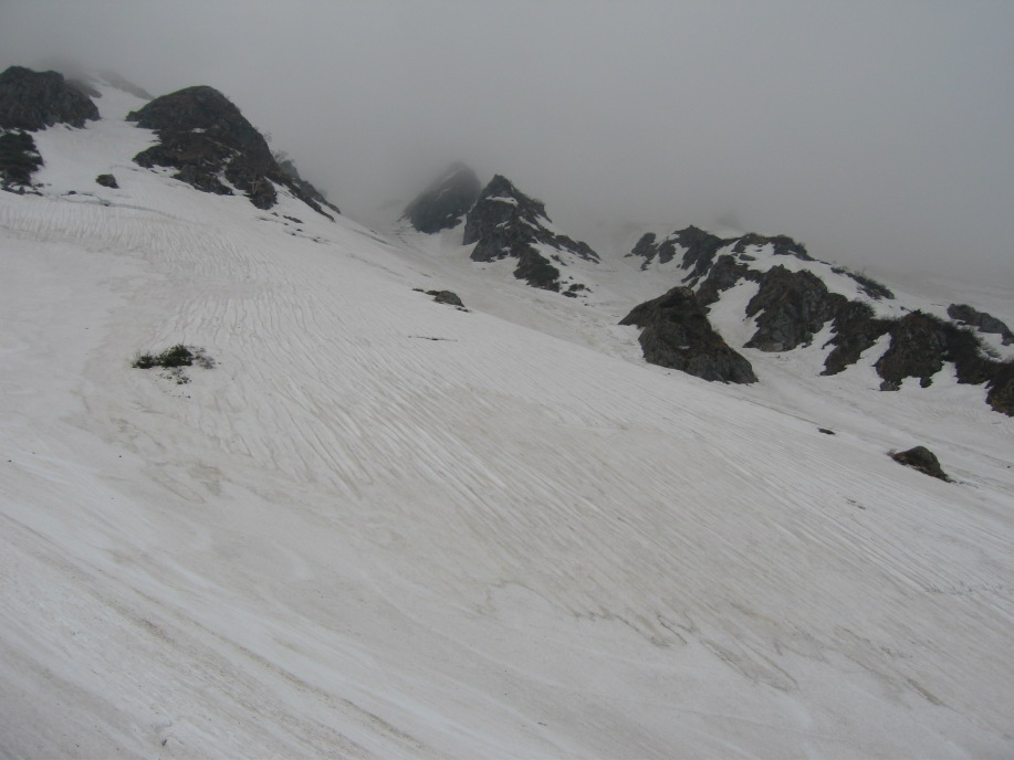 | 五十公野公園を、日帰り組3人泊まり組7人の計10人で出発する。 飯豊山荘までの車道は、例年ならば5月の末頃に開通なのだが、今年は先日開通したばかり、おかげで飯豊山荘までは歩かずに済んだ。日帰り組は泊まりの組の、共同装備を少し分けて貰い出発する。 車止めゲート先の林道両側はブナ林、新緑が綺麗で、空気も美味しく、とても気持ちが良かった。 温身平を過ぎて砂防ダムで休憩する。ダムは雪解け水で水量が多い。 ここから約1時間くらいで雪渓に取り付いた。 今年は例年に比べて、やはり雪が少ない。 石転びの出会い付近迄、全員一緒に登るが、そこから日帰り組は登るピッチを上げる。 荷物が軽い分、泊まり組とは、距離がどんどん離れ、人が豆粒くらいの大きさに見える位迄離れた。しかしお互いに無線で連絡を取り合う。 雪渓上はスキーで滑降してくる登山者が多かった。スキーで滑降したらとても気持ちが良さそうだ、でもスキー上級者でなければ上部の急斜面の滑降は難しいと思う。 ほん石転び沢付近で、大きさが50cm位の雪の固まりが勢いよく、我々めがけて落ちて来た。一瞬緊張するが、なんとか避ける。 でも、我々に当たったらと思うと寒気がした。 北股岳山頂の視界は30m位、ガスの中で周囲は何も見えず又山頂付近は雪がなかった。 記念写真を撮影をして早速梅花皮小屋迄下山する。 小屋の中で日帰り組だけで昼食を摂り終える頃、泊まりの組が小屋に到着した。 我々も小屋に泊まりゆっくりしたい気持ちだったが、明日用事があり、残念ながら小屋には泊まれず小屋を後にして雪渓を下った。 そして無事に駐車場に到着した。 |