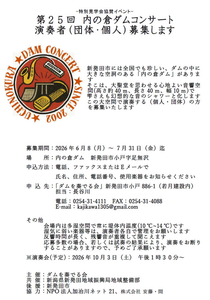 ダム空洞で演奏する方を募集します。