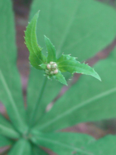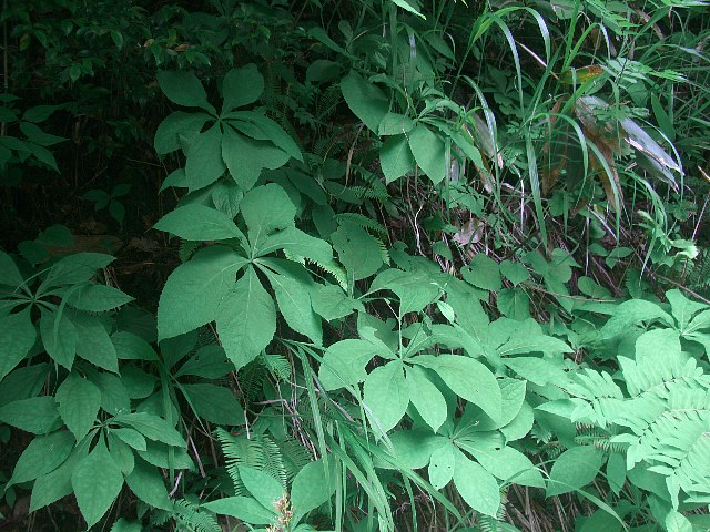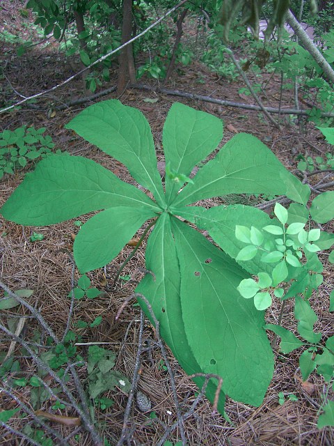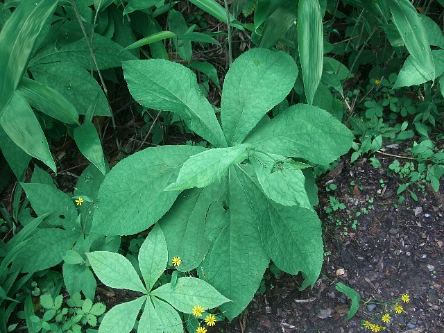 車輪のような大きな葉を8枚前後茎の中程につけます。五十公野公園の木道からつながる道を 入ったところに、何本もありました。大きな葉にびっくりです。 撮影場所:新潟県新発田市五十公野公園遊歩道 大沢 撮影日時:2008年6月7日