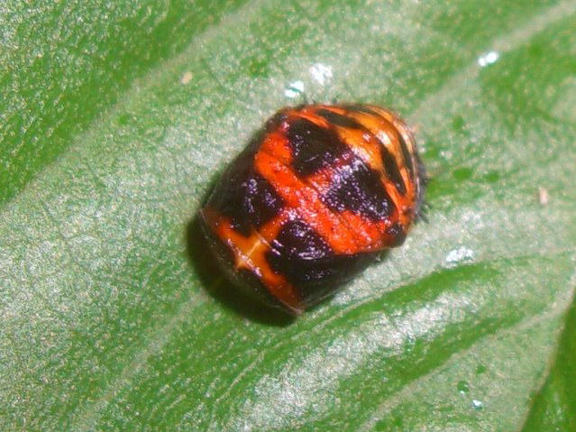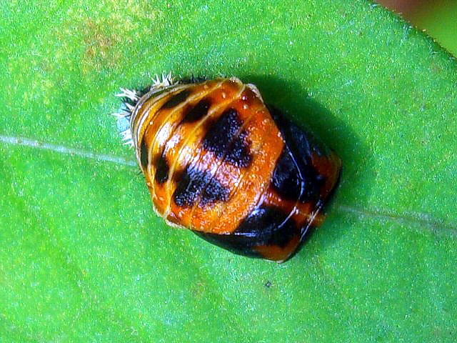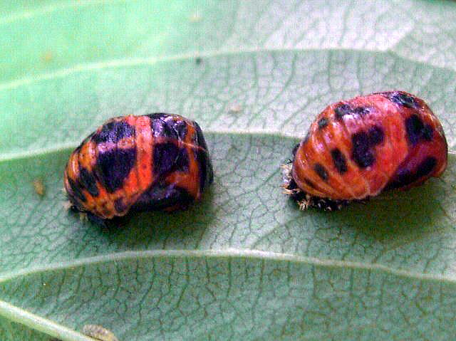テントウムシのさなぎが桜の葉についていました。2匹一緒についているのを、はじめてみました。 成虫の模様が違うように、サナギの模様も違います。 撮影場所:新潟県新発田市車野小学校、五十公野公園 撮影日時:2008年6月1日、7日