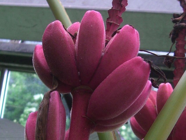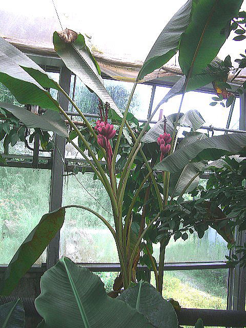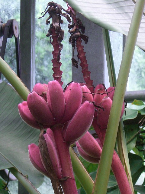 学名ムサ ベルチア。新潟県阿賀野市にある安田フラワーガーデンで見つけました。濃いピンクの実が上向きについていました。聞くと、他のバナナと違って、垂れ下がらないのだそうです。 1番大きな特徴は、実の中に種があることです。真っ黒な種がびっしりはいっているそうです。 バナナは、この種がない品種が見つかったことが全世界に広がった理由だと言われています。